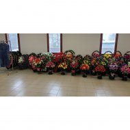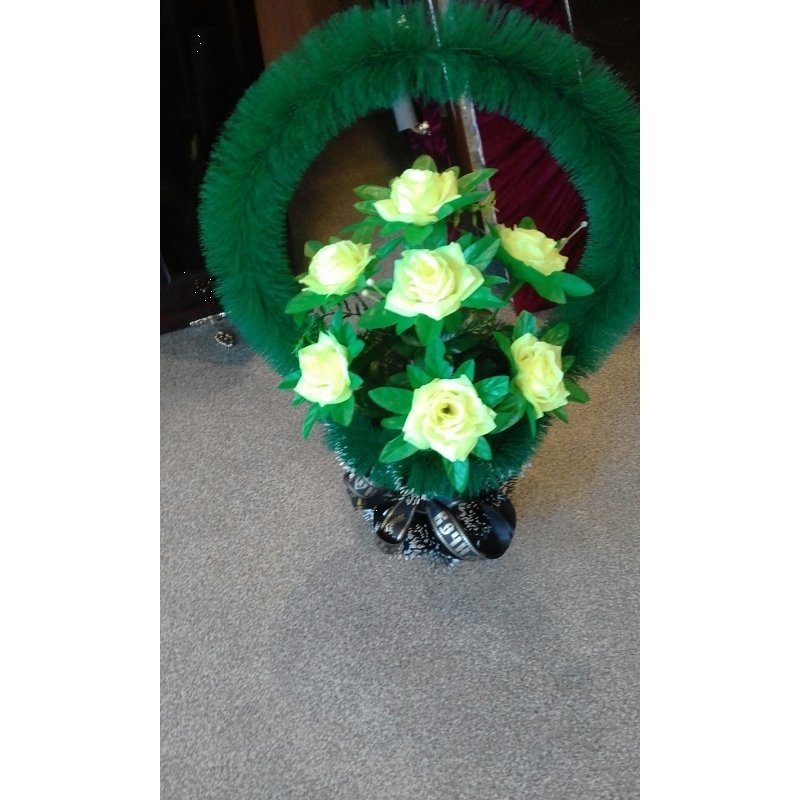 Форма венка может быть любой. Обычно делают круглые или овальные венки, для выражения особой скорби — в форме сердца. В этом же разделе каталога представлены корзины с цветочной композицией для установки в помещении для панихиды или на могиле.